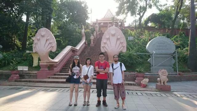 但是在金边城内,这就算是最高的宗教建筑。上山石阶两侧是柬埔寨经典的七头蛇神雕像,有个历史性建筑的石碑。